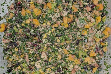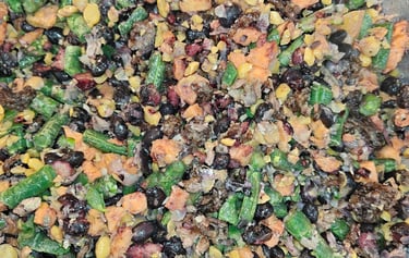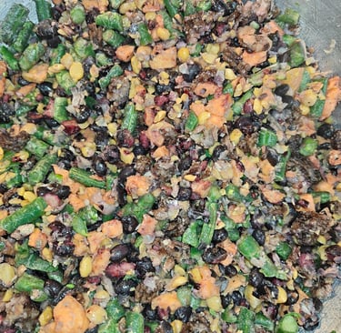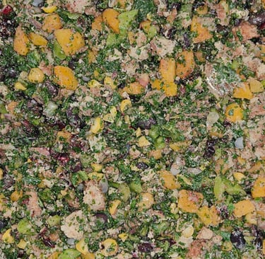 Turkey, Internal Organs, Kale, Butter Nut Squash, Chic Peas, Black Beans, Sardines, Blueberries, Apple Cider Vinegar, Olive Oil, MCT Oil, Ginger, Cumin